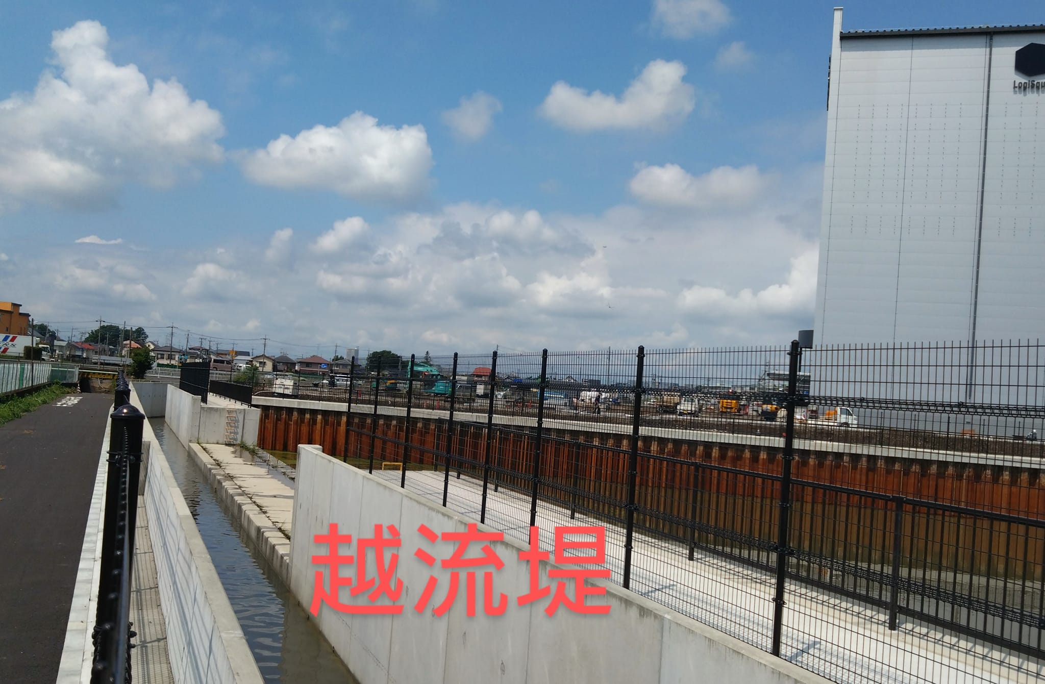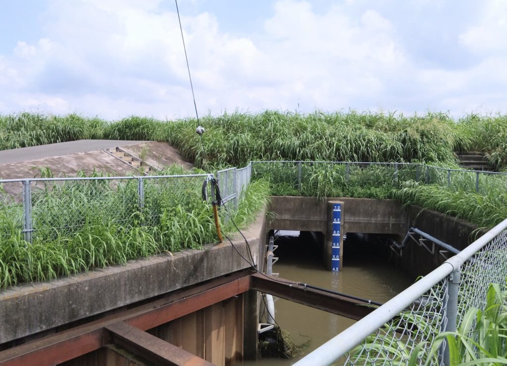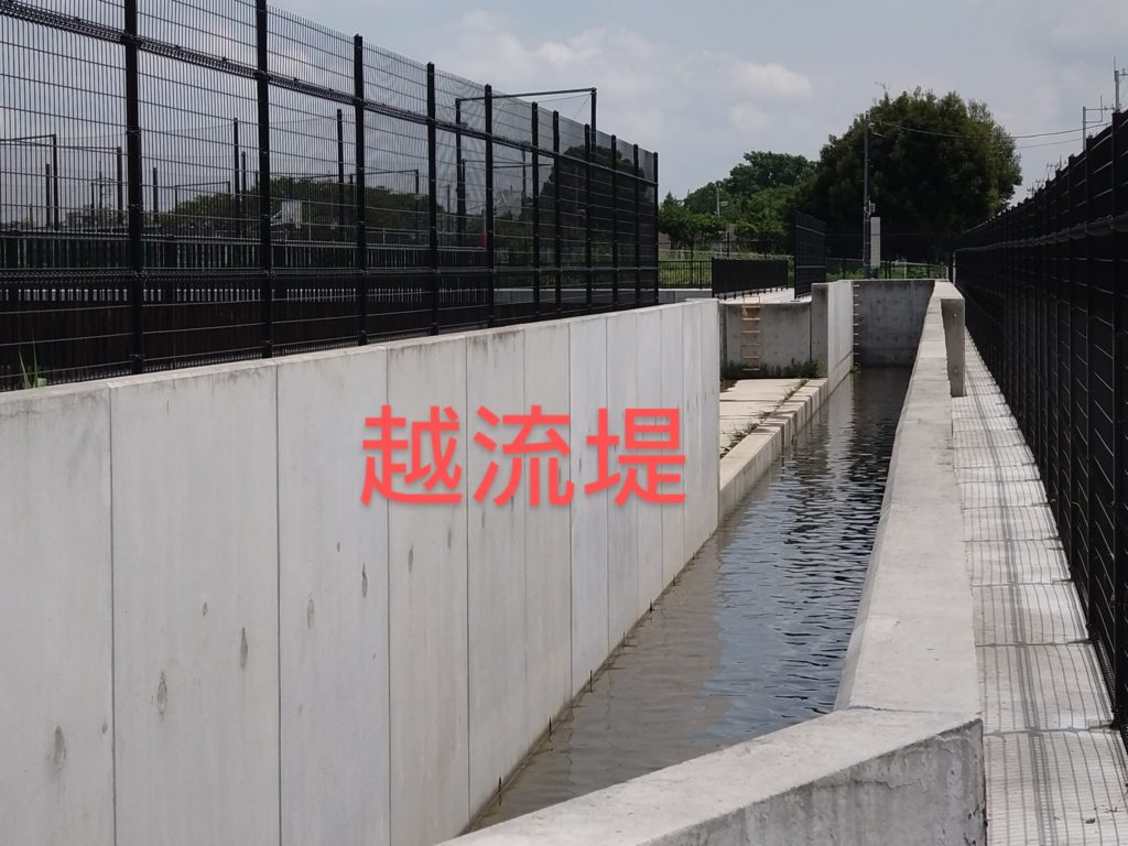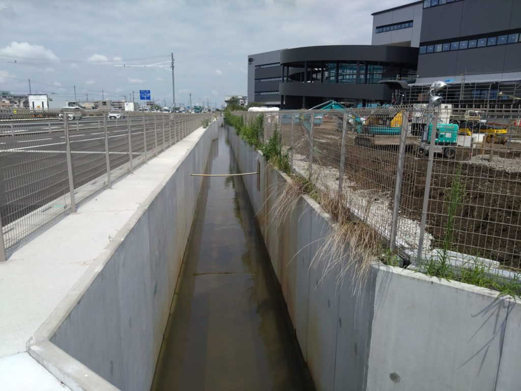 区域外からの雨水は国道254号バイパス沿いの用水路を流れ、越流堤で第2調整池に排出されます。これにより福岡江川への排出を抑制しています。